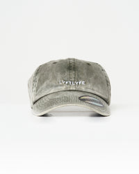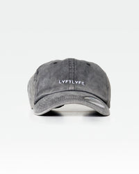 Front view of LYFTLYFE acid wash black dad hat with curved bill and front logo embroidery.