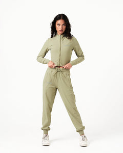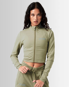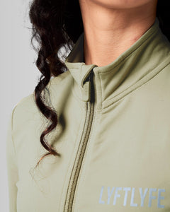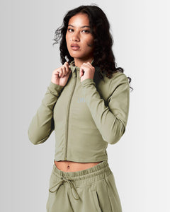 Front view of Breathe Women’s Zip-Up Crop in green with a reflective Lyftlyfe logo on the left chest and a flattering cropped fit.